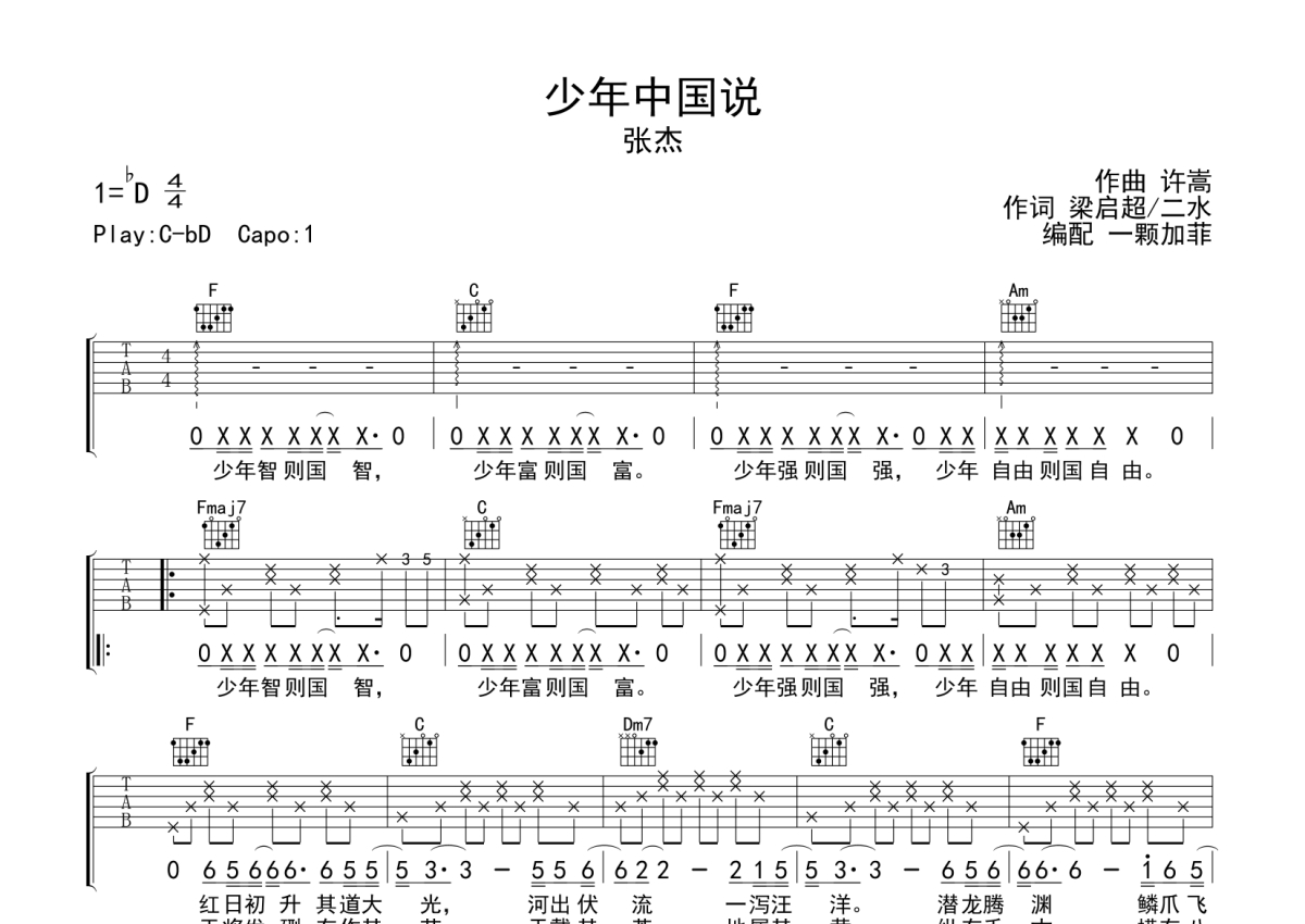 《少年中国说》是张杰演唱的一首歌曲,本吉他谱采用的是C调指法编配,这份吉他谱共有两张高清图谱,图谱由 @一颗加菲 编配上传,图谱使用六线谱编配,包含吉他和弦指法、简谱以及歌词部分,曲谱配备了相关的音频提供试听,使用这份少年中国说吉他谱,可以让你更加方便地掌握这首歌曲的弹唱技巧,快来尝试吧。