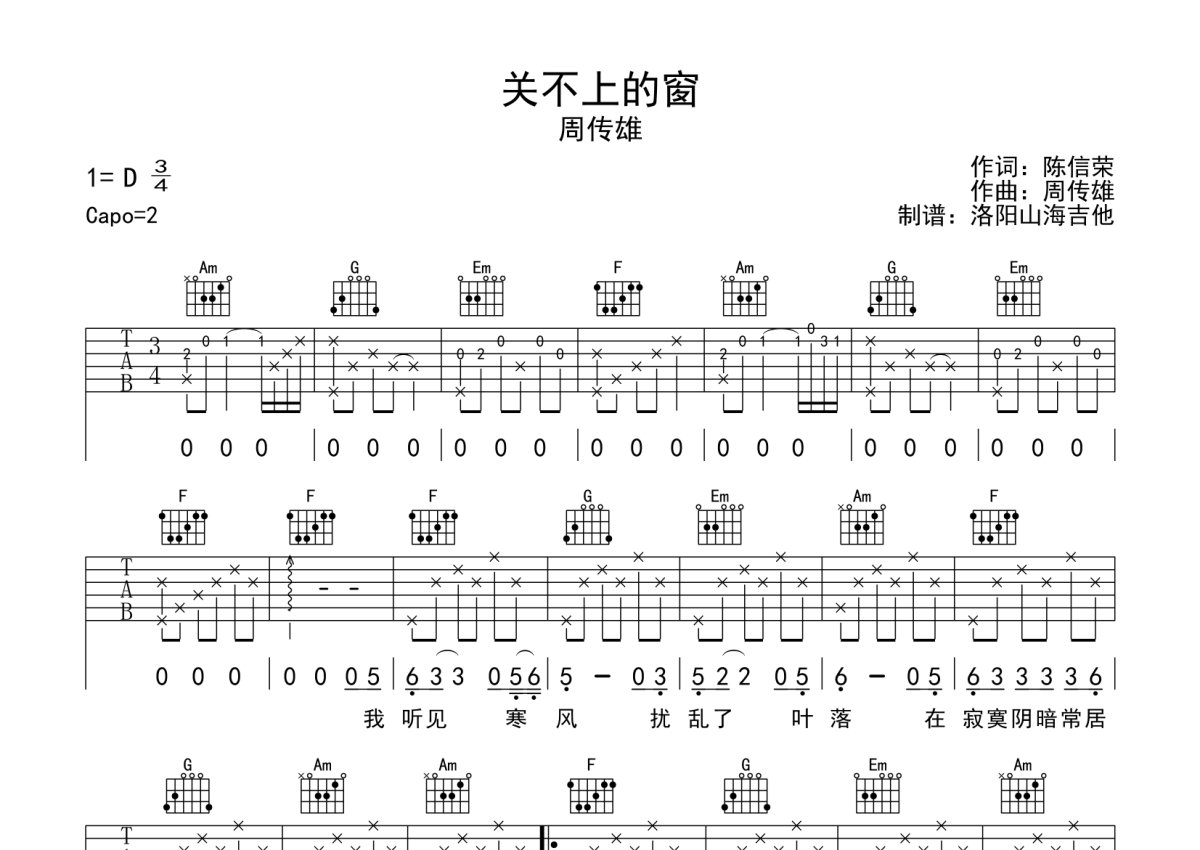 周传雄《关不上的窗》吉他谱 - C调弹唱六线谱