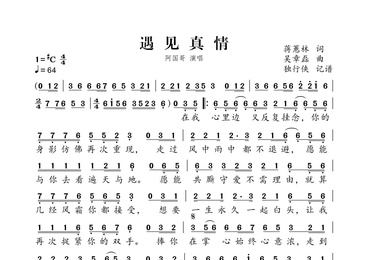 《遇见真情》是阿国哥演唱的一首歌曲,拍号为4/4拍,歌曲速度为每分钟64拍,这份简谱共有一张高清图谱,图谱由 @独行侠 编配上传。