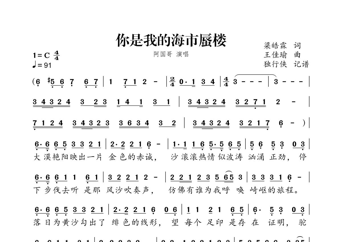 《你是我的海市蜃楼》是阿国哥演唱的一首歌曲,拍号为4/4拍,歌曲速度为每分钟91拍,这份简谱共有两张高清图谱,图谱由 @独行侠 编配上传。
