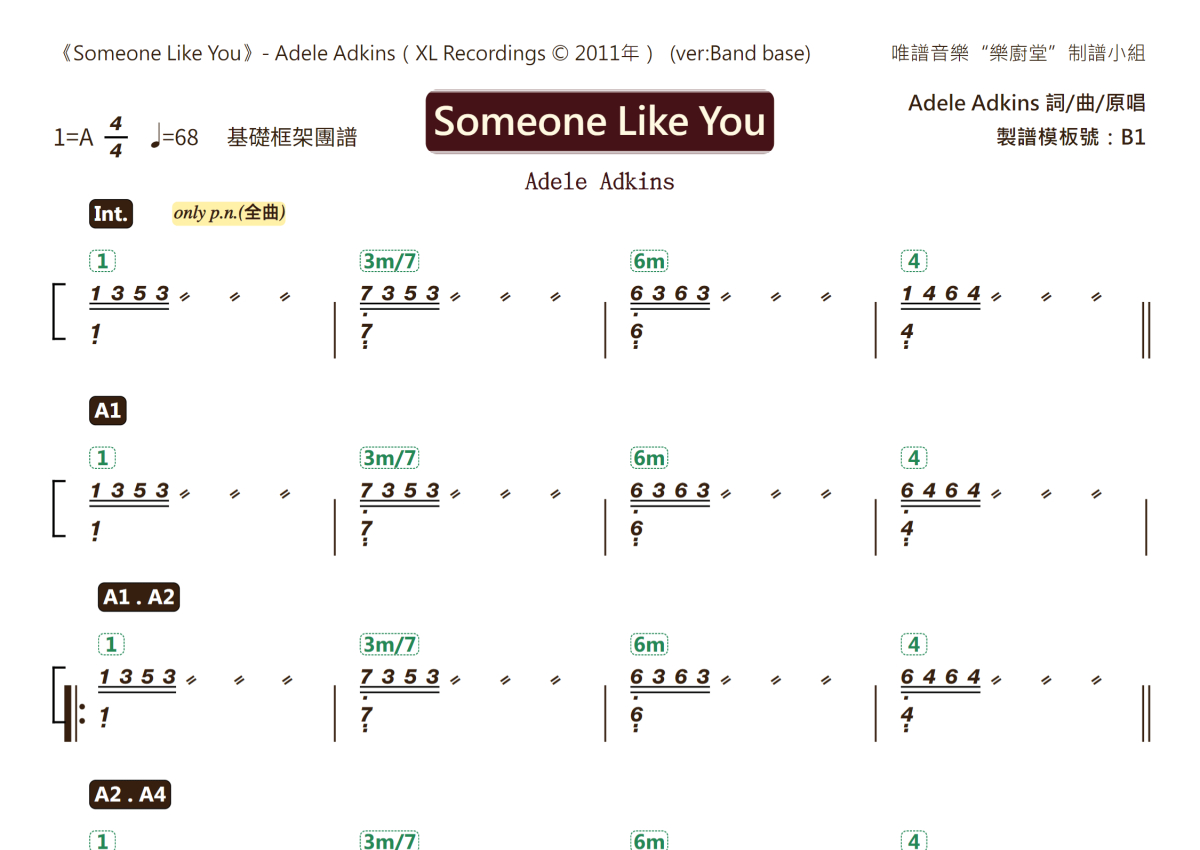 Adele《Someone like you》乐队总谱 - 基础框架版团谱