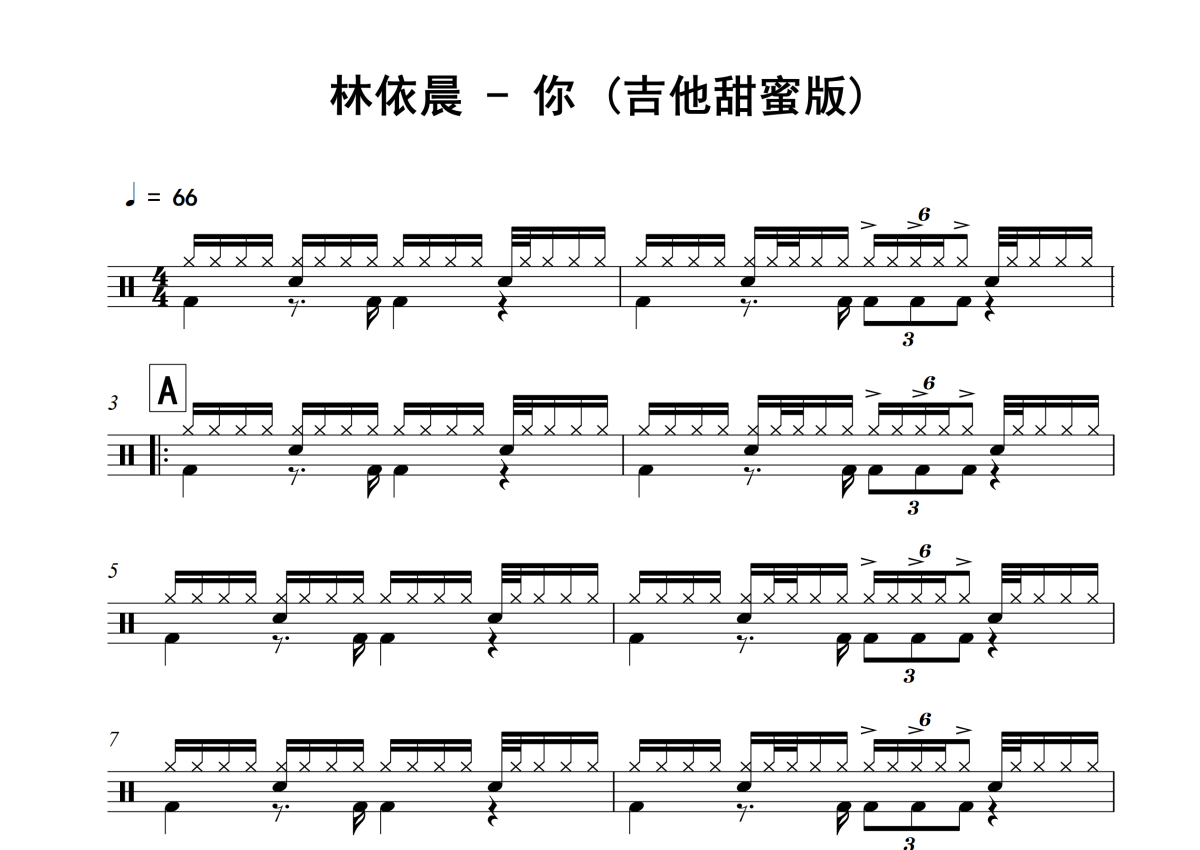 《你》是林依晨演唱的一首歌曲,(吉他甜蜜版),拍号为4/4拍,歌曲速度为每分钟66拍,这份架子鼓谱共有三张高清图谱,图谱由 @积极处世 编配上传,图谱使用五线谱编配,使用这份你架子鼓谱,你将能够轻松地敲打出这首林依晨的你,快来尝试吧。