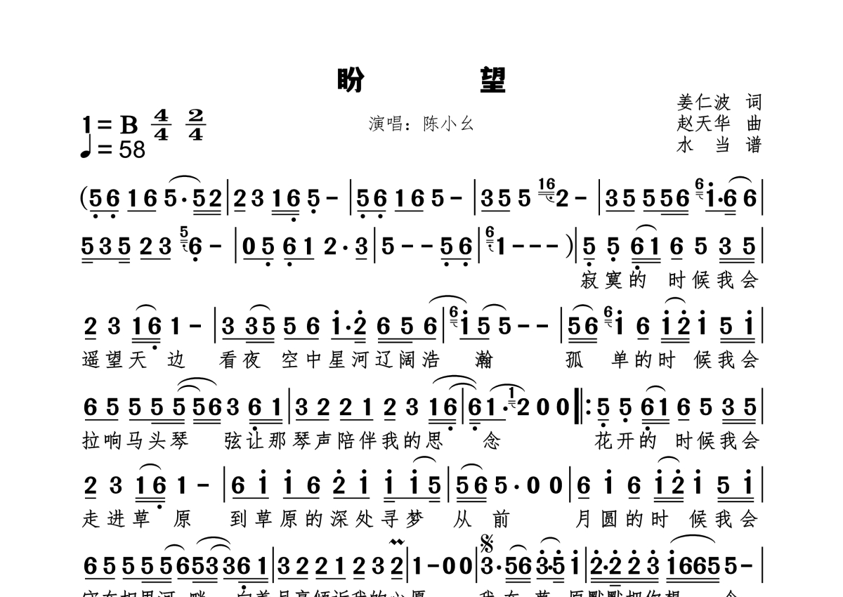 《盼望》是陈小幺演唱的一首歌曲,拍号为4/4拍,歌曲速度为每分钟58拍,这份简谱共有一张高清图谱,图谱由 @水当 编配上传原调B。