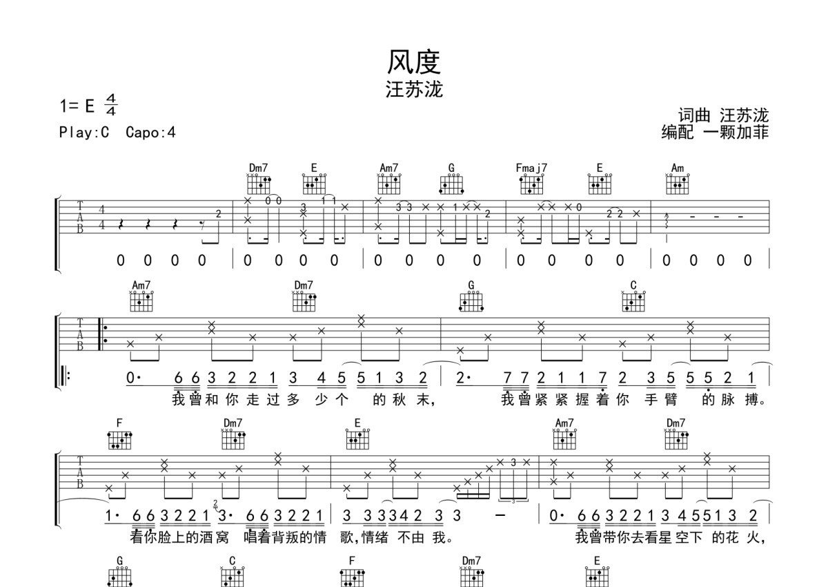风度吉他谱 - 汪苏泷演唱 - C调弹唱六线谱