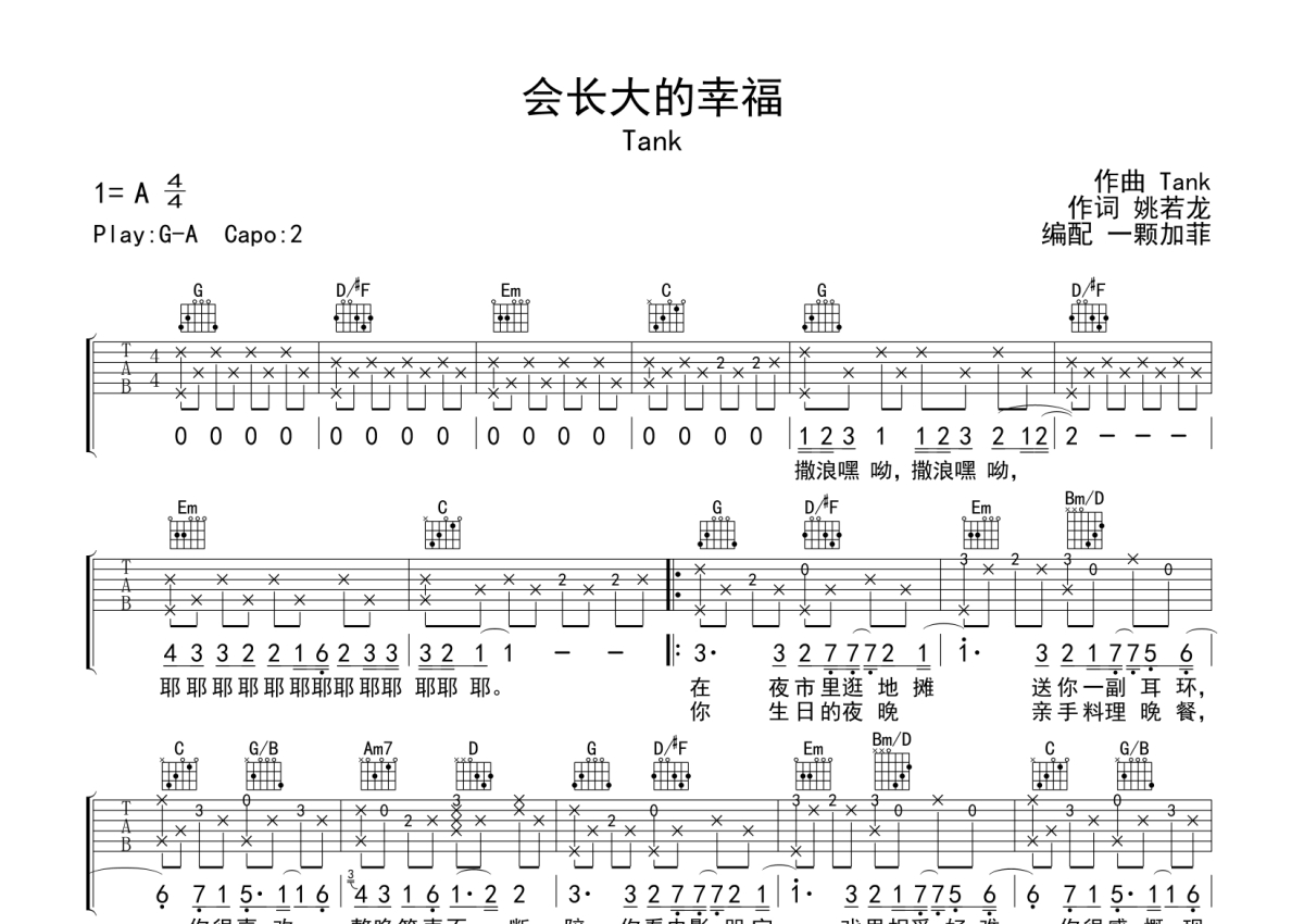 《会长大的幸福》是Tank演唱的一首歌曲,本吉他谱采用的是G调指法编配,这份吉他谱共有两张高清图谱,图谱由 @一颗加菲 编配上传,图谱使用六线谱编配,包含吉他和弦指法、简谱以及歌词部分,曲谱配备了相关的音频提供试听,使用这份会长大的幸福吉他谱,可以让你更加方便地掌握这首歌曲的弹唱技巧,快来尝试吧。