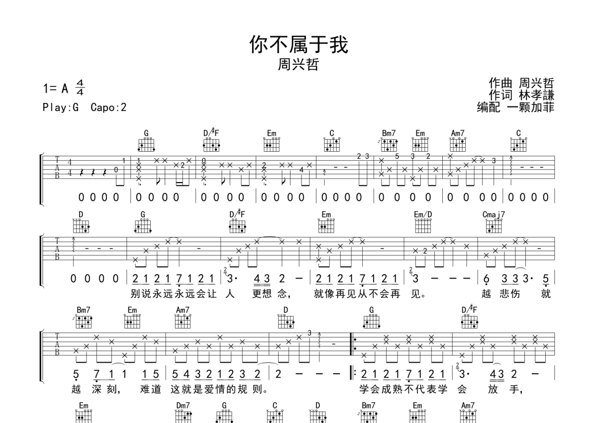 你不属于我吉他谱 - 周兴哲演唱 - G调弹唱六线谱