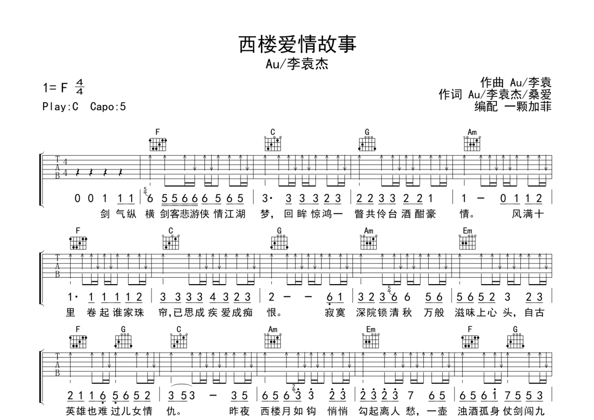 李袁杰/Au《西楼爱情故事》吉他谱 - C调弹唱六线谱