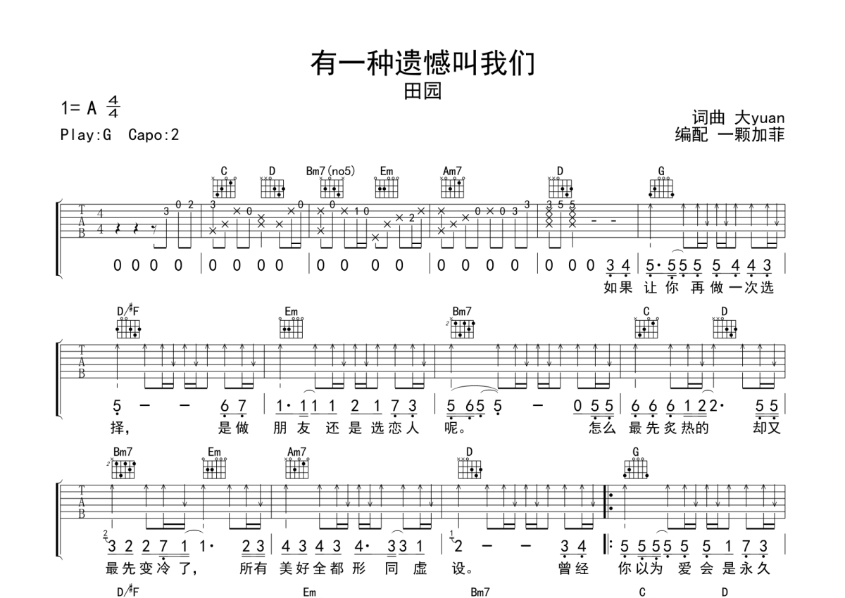 《有一种遗憾叫我们》是田园演唱的一首歌曲,本吉他谱采用的是G调指法编配,这份吉他谱共有两张高清图谱,图谱由 @一颗加菲 编配上传,图谱使用六线谱编配,包含吉他和弦指法、简谱以及歌词部分,曲谱配备了相关的音频提供试听,使用这份有一种遗憾叫我们吉他谱,可以让你更加方便地掌握这首歌曲的弹唱技巧,快来尝试吧。