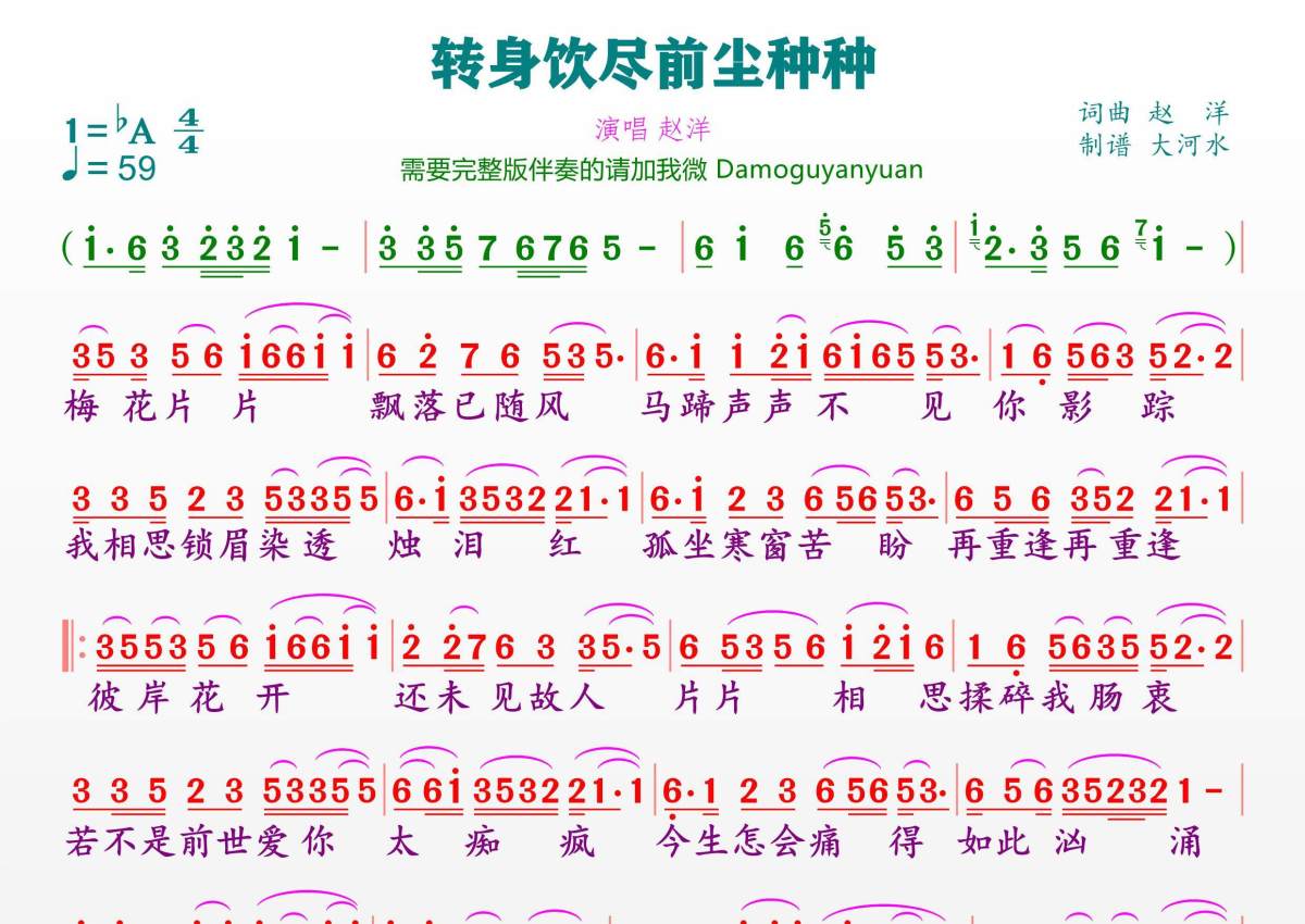 转身饮尽前尘种种简谱 - 赵洋演唱