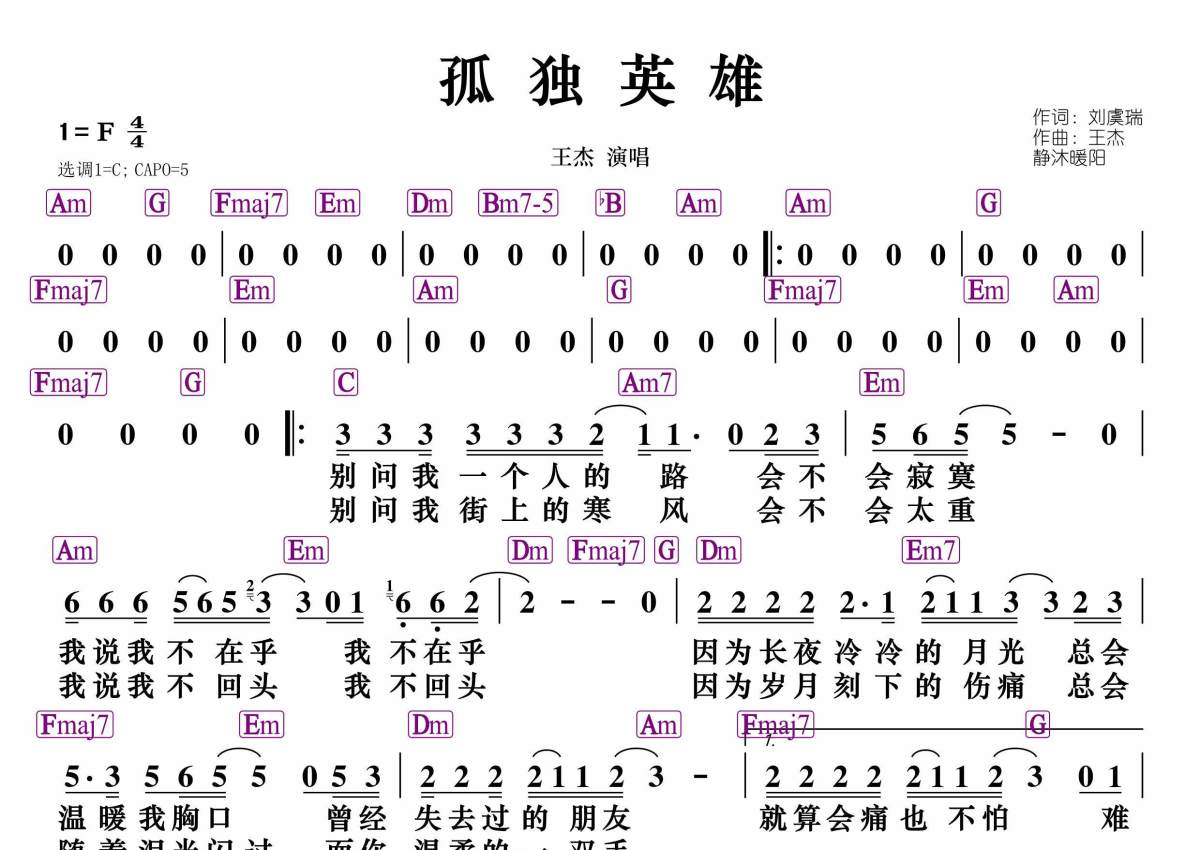 《孤独英雄》是王杰演唱的一首歌曲,拍号为4/4拍,这份简谱共有一张高清图谱,图谱由 @静沐暖阳 编配上传。
