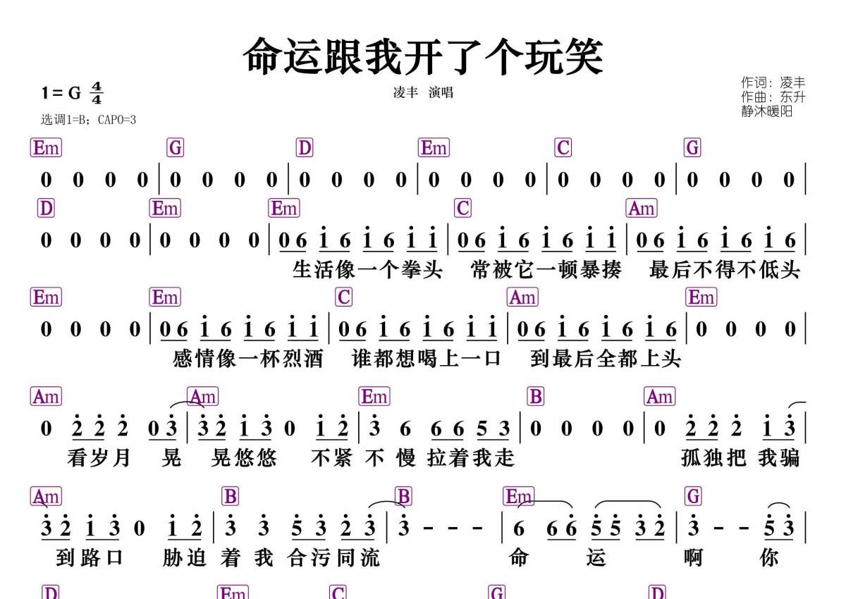 《命运跟我开了个玩笑》是凌丰演唱的一首歌曲,拍号为4/4拍,这份简谱共有一张高清图谱,图谱由 @静沐暖阳 编配上传。