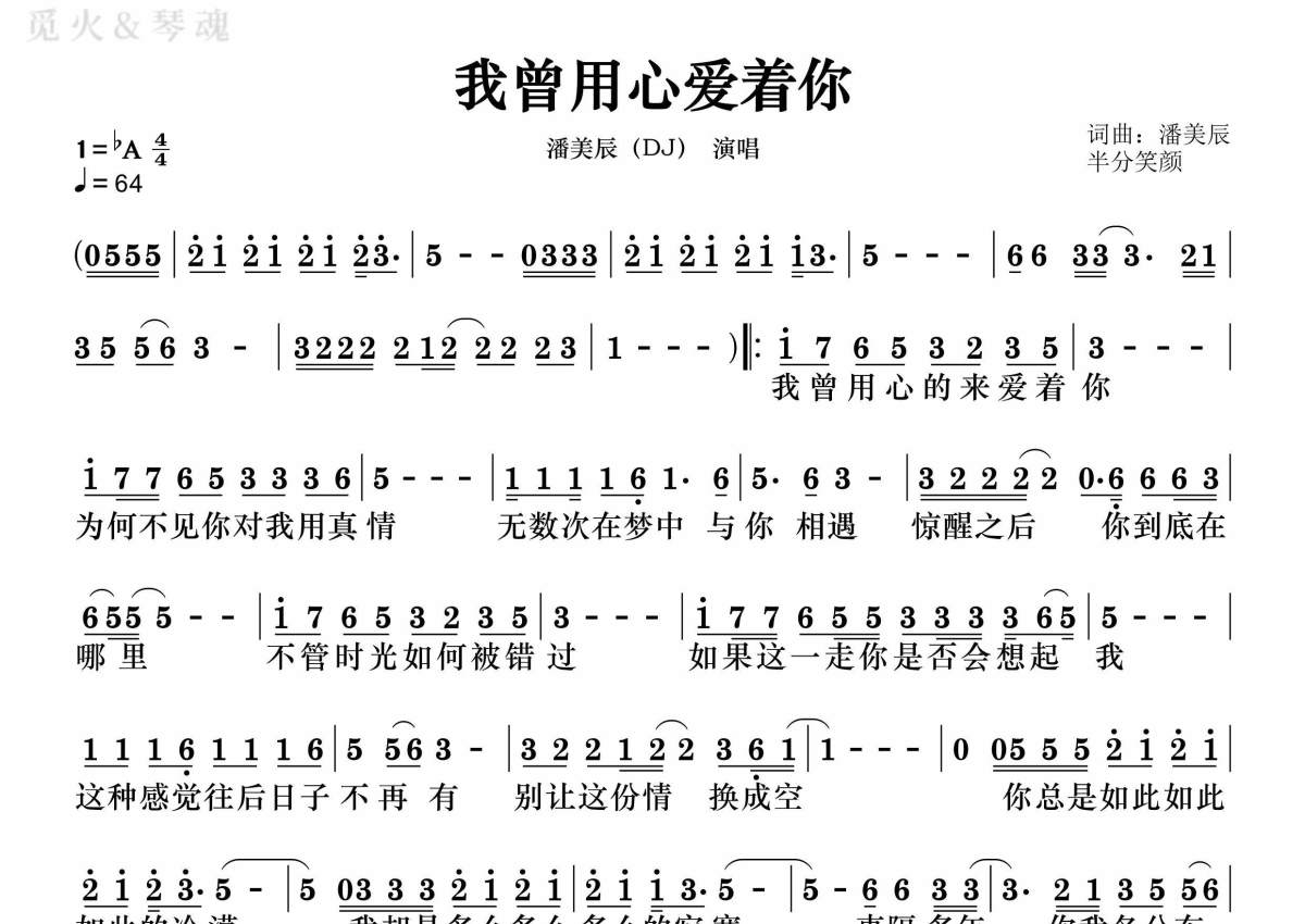 《我曾用心爱着你》是潘美辰演唱的一首歌曲,DJ版,歌曲速度为每分钟64拍,这份简谱共有一张高清图谱,图谱由 @静沐暖阳 编配上传。