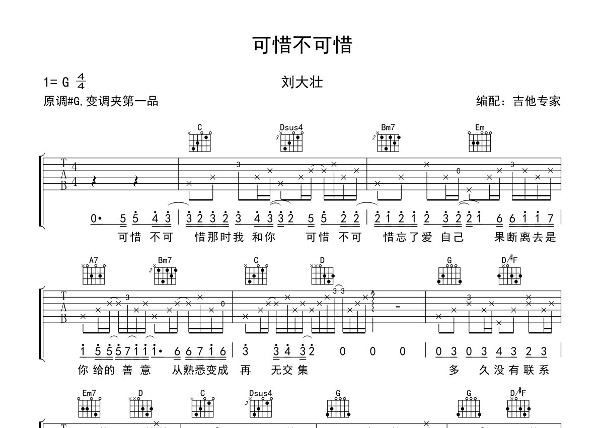 刘大壮《可惜不可惜》吉他谱 - G调弹唱六线谱