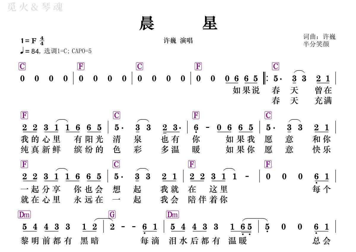 《晨星》是许巍演唱的一首歌曲,和弦谱,拍号为4/4拍,歌曲速度为每分钟84拍,这份简谱共有一张高清图谱,图谱由 @静沐暖阳 编配上传。