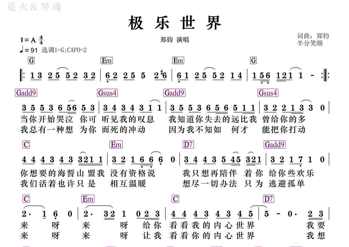 《极乐世界》是郑钧演唱的一首歌曲,和弦谱,拍号为4/4拍,歌曲速度为每分钟91拍,这份简谱共有一张高清图谱,图谱由 @静沐暖阳 编配上传。