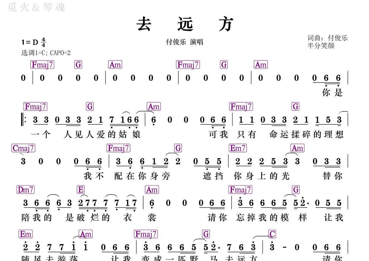 《去远方》是付俊乐演唱的一首歌曲,和弦谱,拍号为4/4拍,这份简谱共有一张高清图谱,图谱由 @静沐暖阳 编配上传。