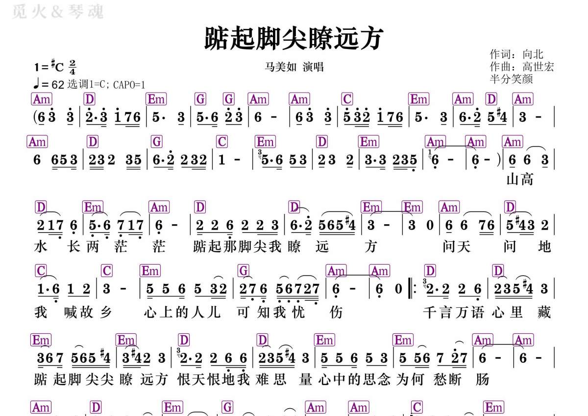 《踮起脚尖瞭远方》是马美如演唱的一首歌曲,和弦谱,拍号为3/4拍,歌曲速度为每分钟62拍,这份简谱共有一张高清图谱,图谱由 @静沐暖阳 编配上传。