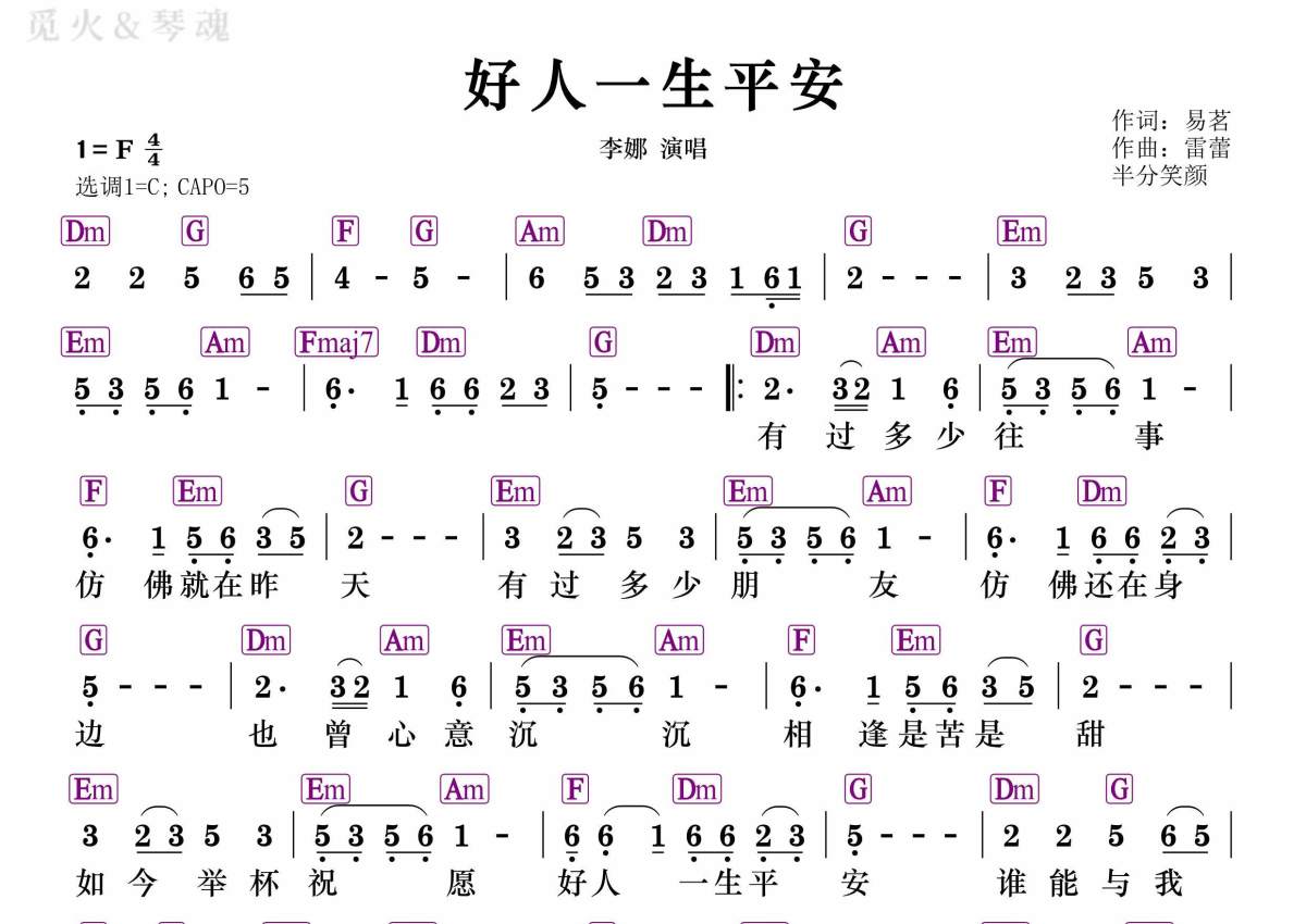 《好人一生平安》是李娜演唱的一首歌曲,和弦谱,拍号为4/4拍,这份简谱共有一张高清图谱,图谱由 @静沐暖阳 编配上传。
