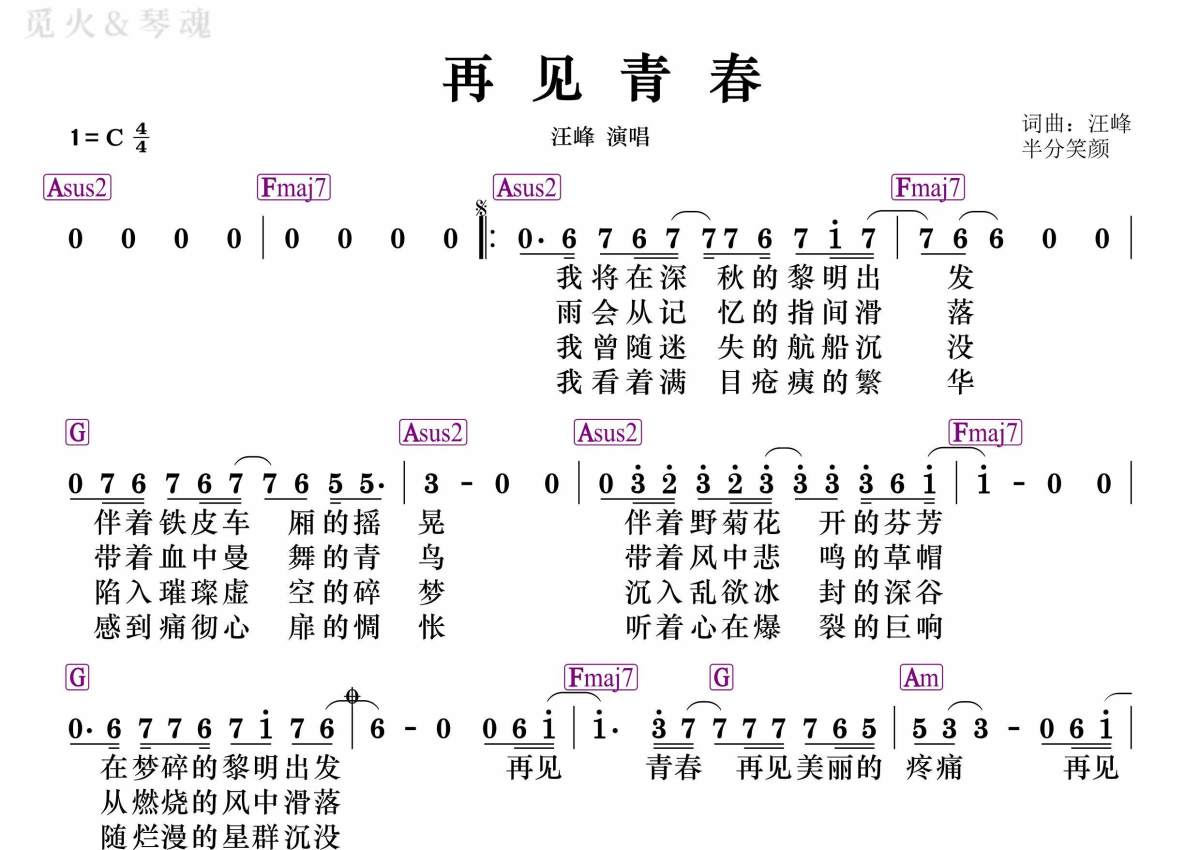 汪峰《再见青春》简谱 - 和弦谱