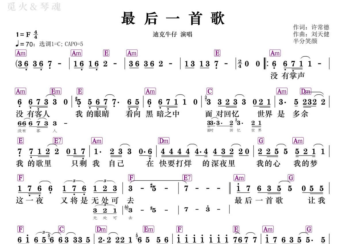 《最后一首歌》是迪克牛仔演唱的一首歌曲,和弦谱,拍号为4/4拍,歌曲速度为每分钟70拍,这份简谱共有一张高清图谱,图谱由 @静沐暖阳 编配上传。
