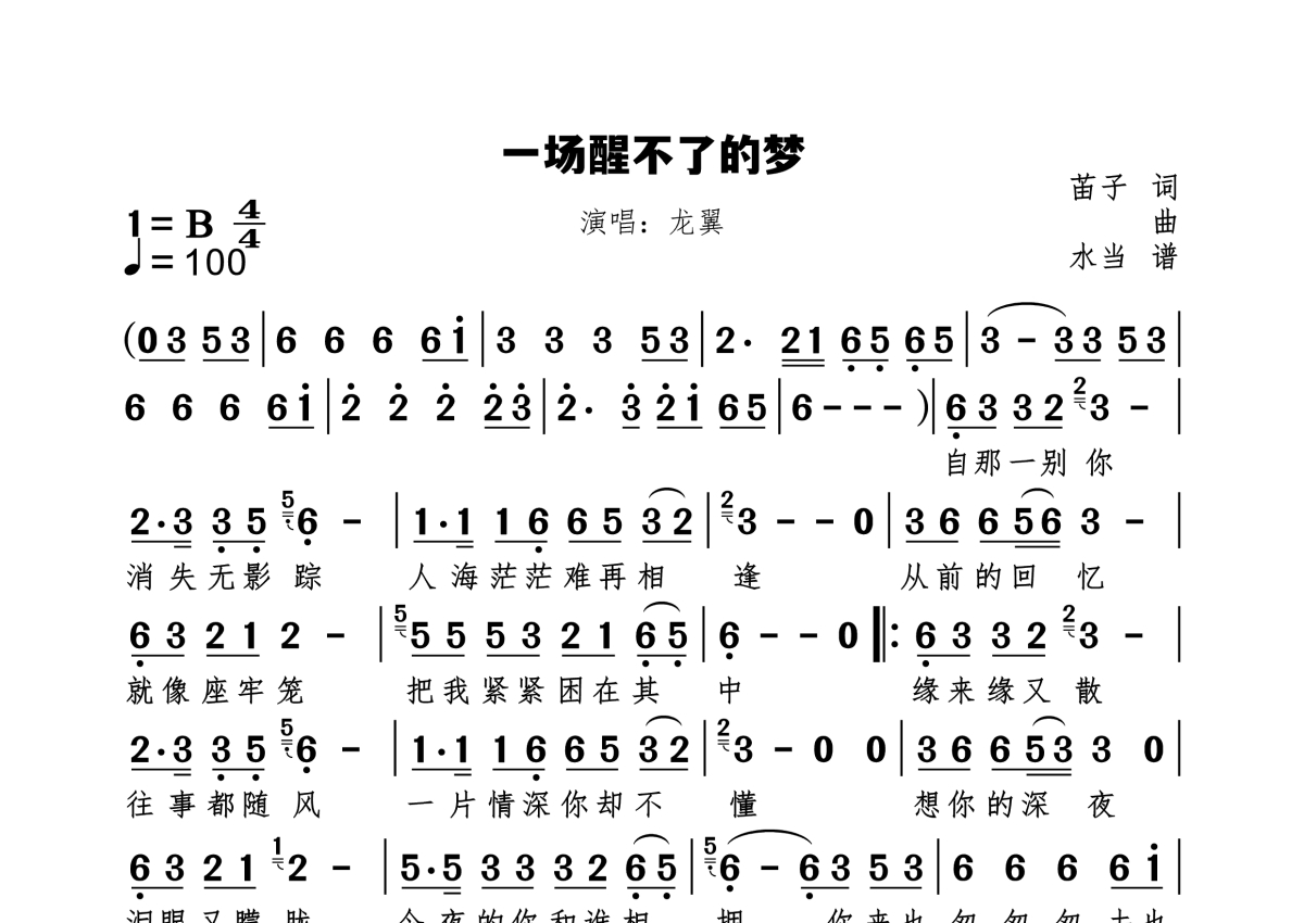 《一场醒不了的梦》是龙翼演唱的一首歌曲,拍号为4/4拍,歌曲速度为每分钟100拍,这份简谱共有一张高清图谱,图谱由 @水当 编配上传原调B。