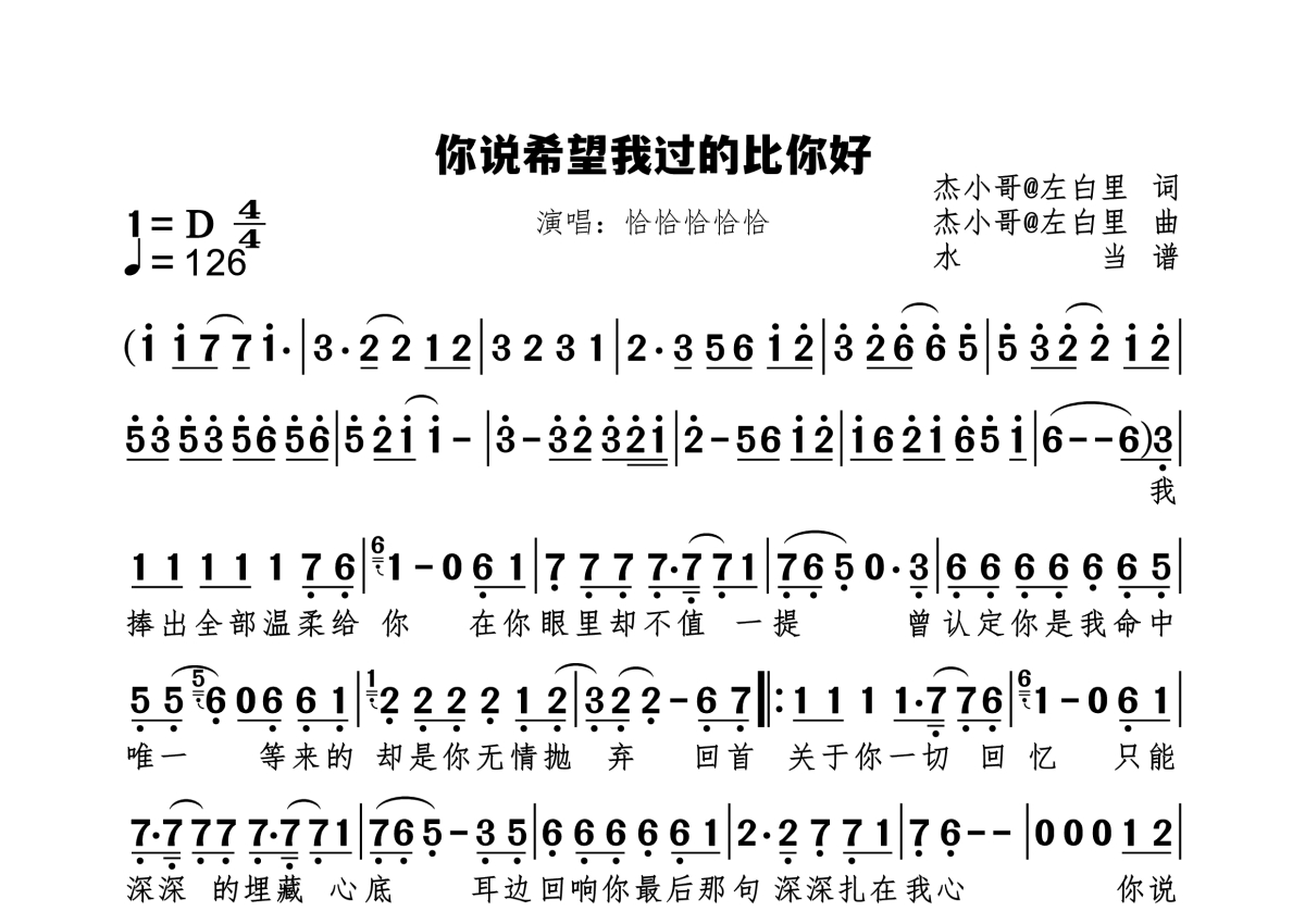 《你说希望我过的比你好》是恰恰恰恰恰演唱的一首歌曲,拍号为4/4拍,歌曲速度为每分钟126拍,这份简谱共有一张高清图谱,图谱由 @水当 编配上传原调D。
