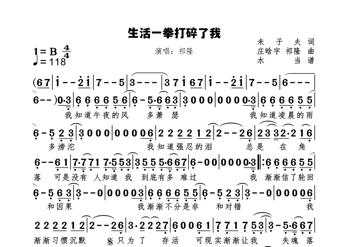 《生活一拳打碎了我》是祁隆演唱的一首歌曲,拍号为4/4拍,歌曲速度为每分钟118拍,这份简谱共有一张高清图谱,图谱由 @水当 编配上传原调B。