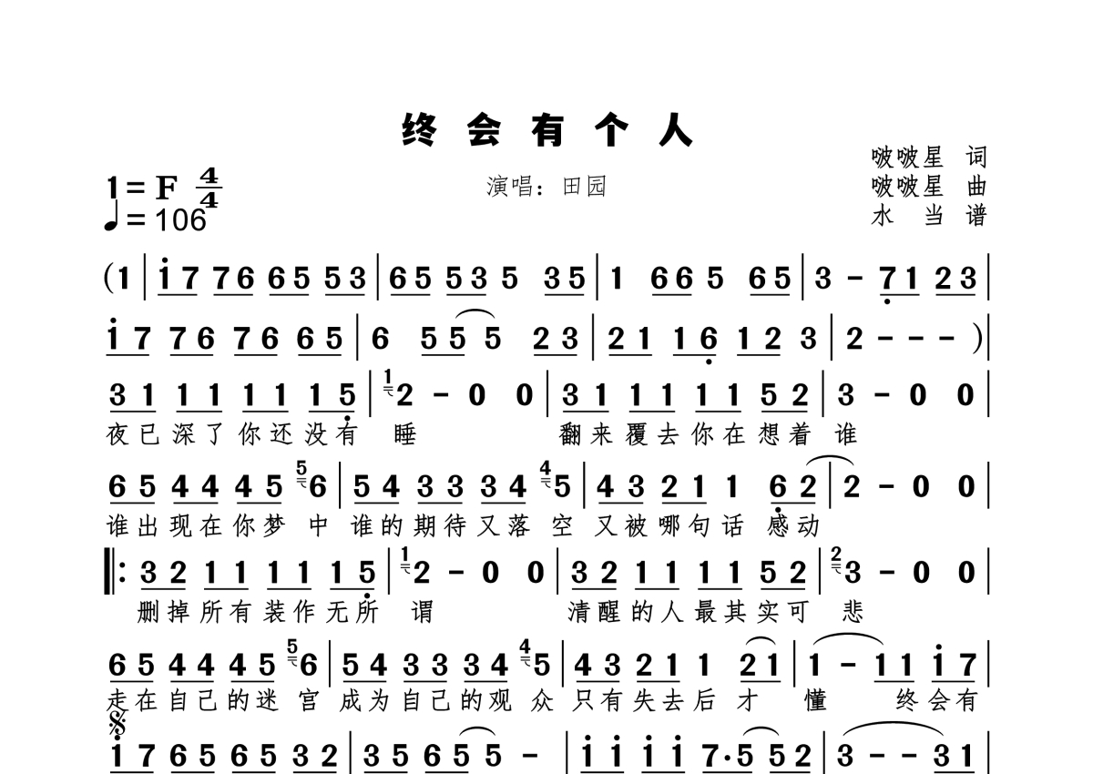 《终会有个人》是田园演唱的一首歌曲,拍号为4/4拍,歌曲速度为每分钟106拍,这份简谱共有一张高清图谱,图谱由 @水当 编配上传原调F。