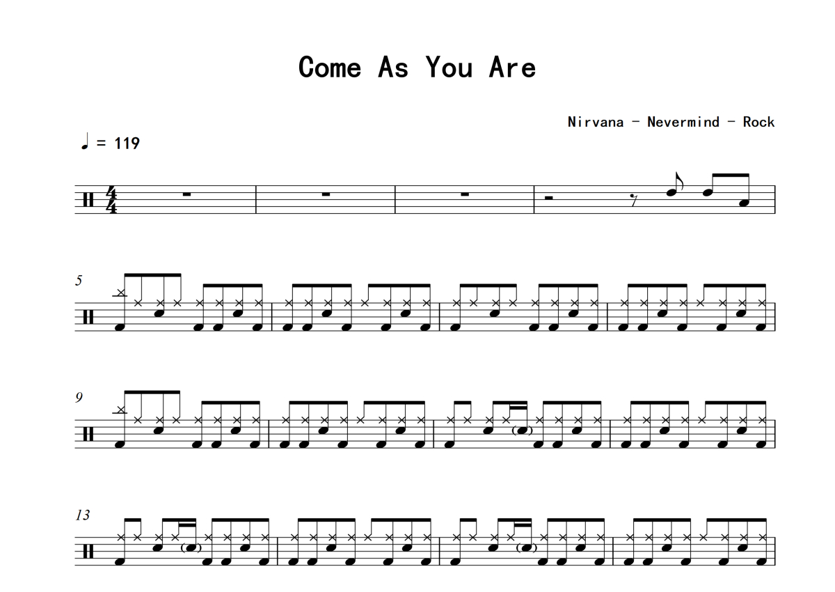 《Come As You Are》是Nirvana演唱的一首歌曲,拍号为4/4拍,歌曲速度为每分钟119拍,这份架子鼓谱共有三张高清图谱,图谱由 @举个例子 编配上传,图谱使用五线谱编配,使用这份Come As You Are架子鼓谱,你将能够轻松地敲打出这首Nirvana的Come As You Are,快来尝试吧。