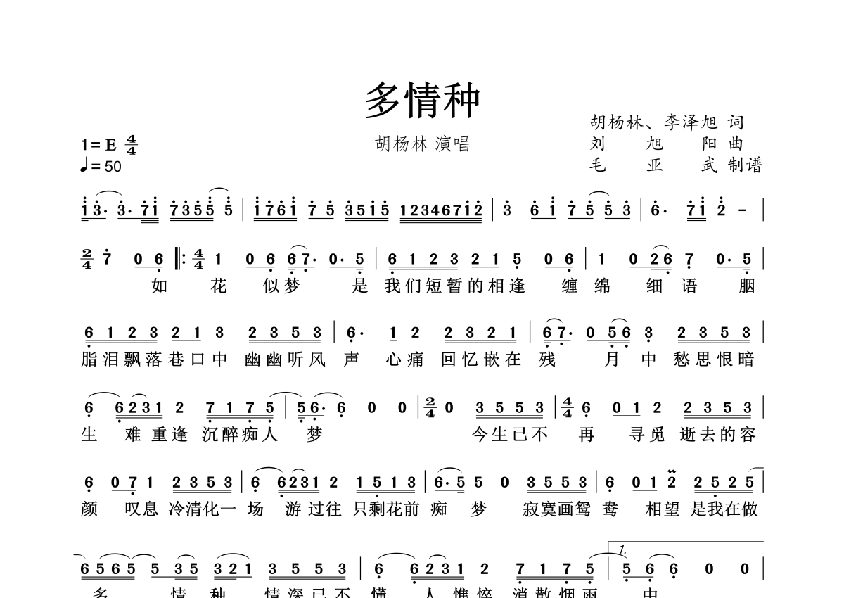 《多情种》是胡杨林演唱的一首歌曲,拍号为4/4拍,这份简谱共有一张高清图谱,图谱由 @秋天的童话 编配上传。