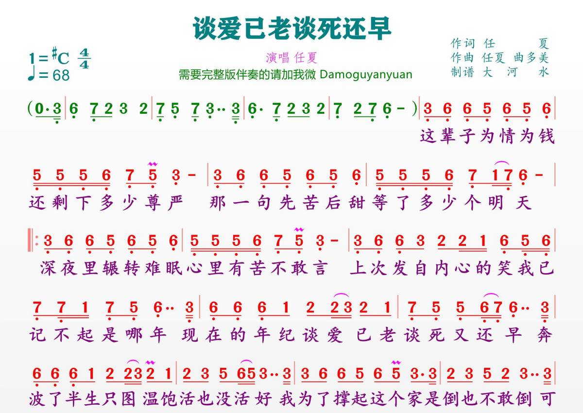谈爱已老谈死还早简谱 - 任夏演唱