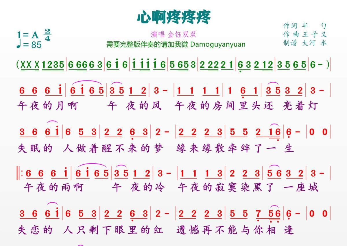《心啊疼疼疼》是金钰双双演唱的一首歌曲,拍号为2/4拍,歌曲速度为每分钟85拍,这份简谱共有一张高清图谱,图谱由 @临海雪原 编配上传。
