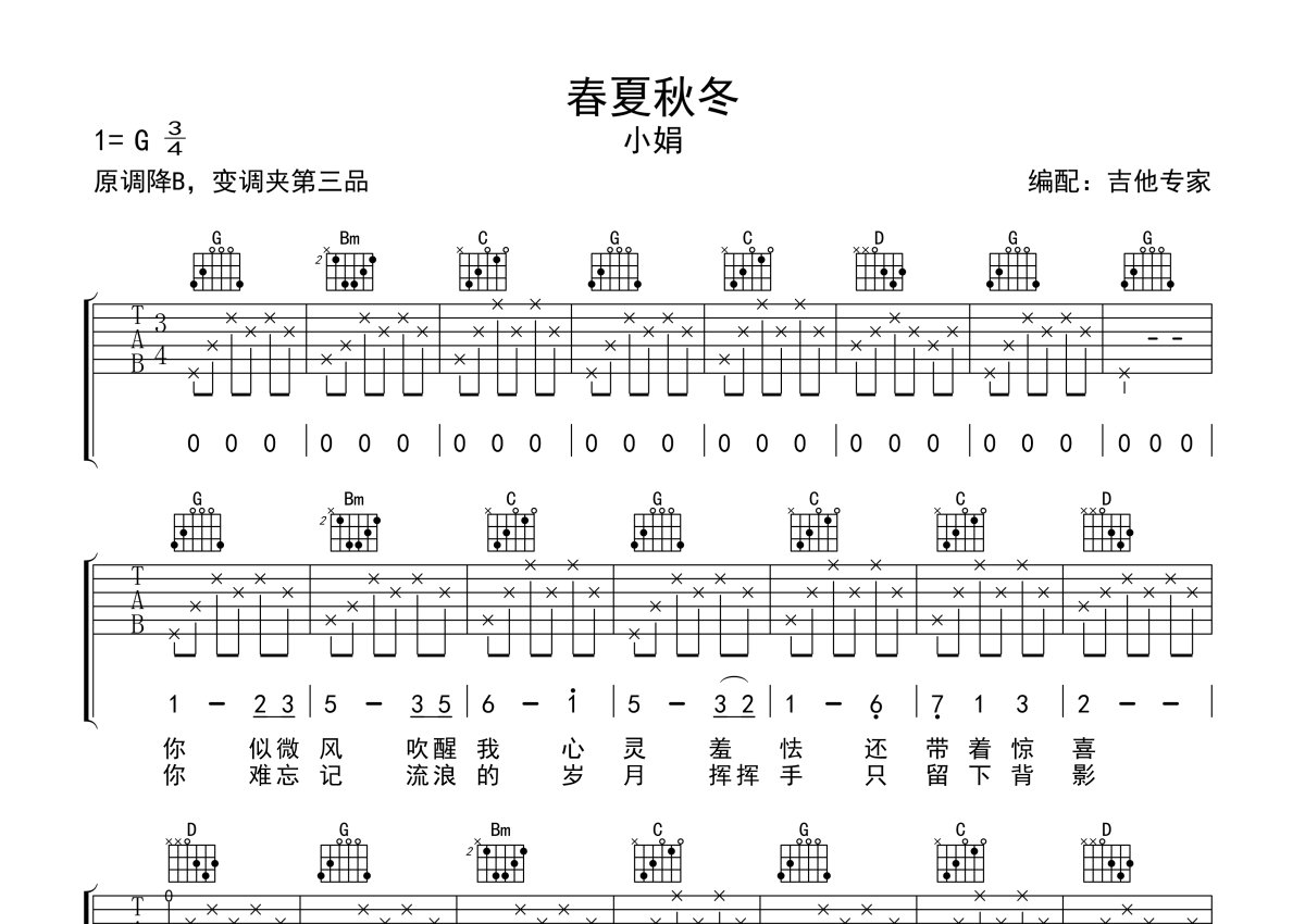 小娟《春夏秋冬》吉他谱 - G调弹唱六线谱