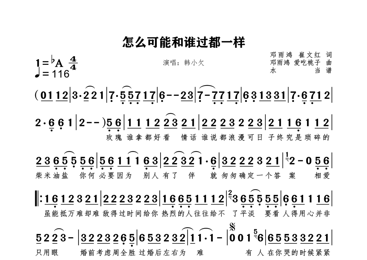 《怎么可能和谁过都一样》是韩小欠演唱的一首歌曲,拍号为4/4拍,歌曲速度为每分钟116拍,这份简谱共有一张高清图谱,图谱由 @水当 编配上传原调bA。