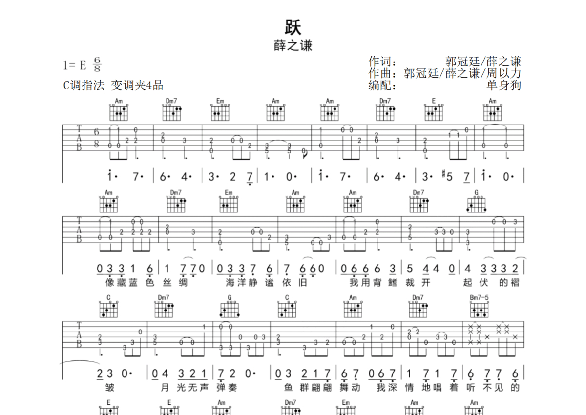 《跃》是薛之谦演唱的一首歌曲,拍号为6/8拍,歌曲原调为E调,但由于原调指法比较难,为了方便弹奏,本吉他谱采用的是C调指法编配,变调夹4品弹奏即为原调,当然也可以根据自己的音域改变变调夹位置,或者通过改变和弦调性,以方便自己弹奏,这份吉他谱共有三张高清图谱,图谱由 @单身狗 编配上传,图谱使用六线谱编配,包含吉他和弦指法、简谱以及歌词部分,使用这份跃吉他谱,可以让你更加方便地掌握这首歌曲的弹唱技巧,快来尝试吧。