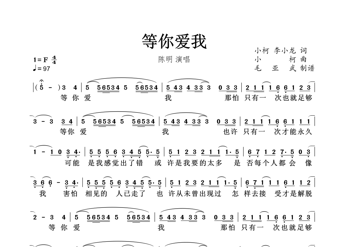 等你爱我简谱 - 陈明演唱