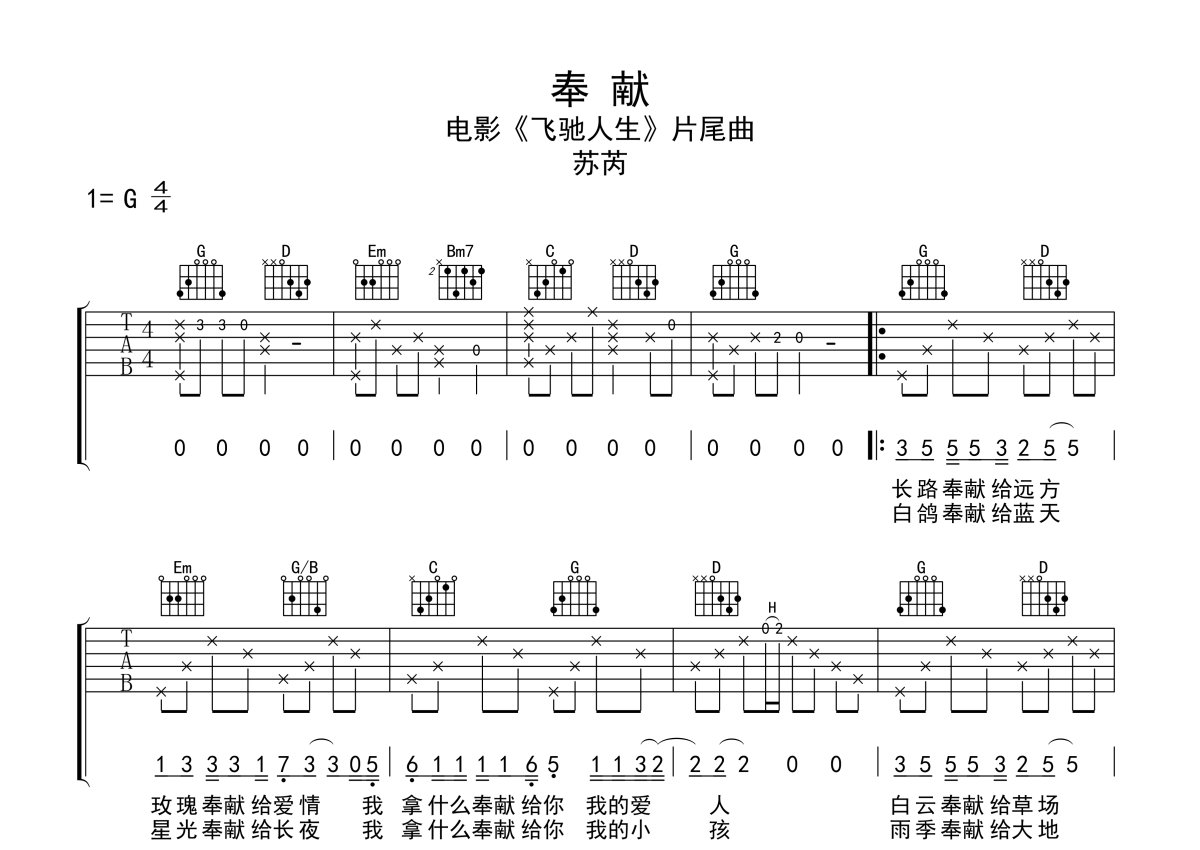 苏芮《奉献》吉他谱 - G调弹唱六线谱