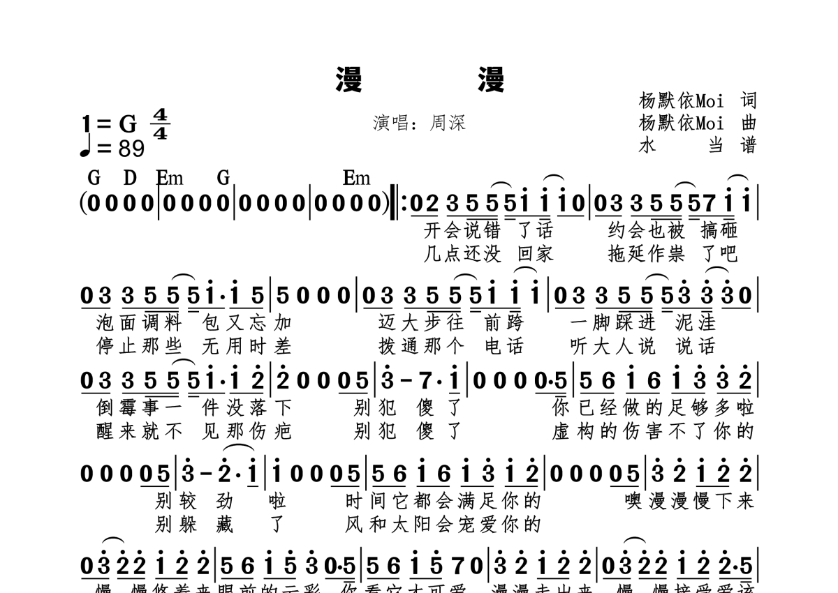 《漫漫》是周深演唱的一首歌曲,拍号为4/4拍,歌曲速度为每分钟89拍,这份简谱共有一张高清图谱,图谱由 @水当 编配上传。