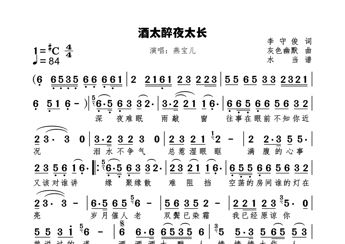 《酒太醉夜太长》是燕宝儿演唱的一首歌曲,拍号为4/4拍,歌曲速度为每分钟84拍,这份简谱共有一张高清图谱,图谱由 @水当 编配上传。