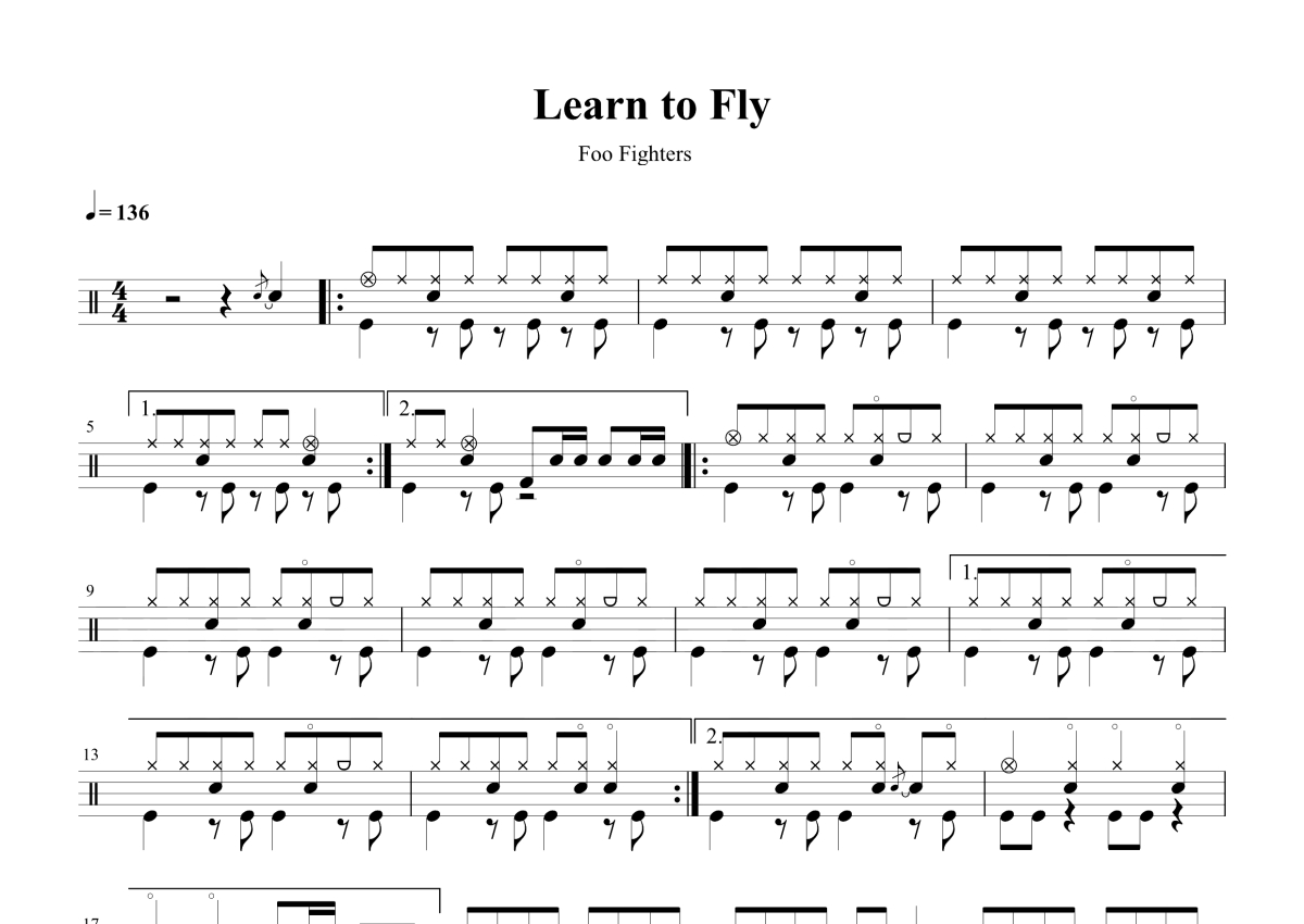 《_Learn to Fly》是Foo Fighters演唱的一首歌曲,拍号为4/4拍,歌曲速度为每分钟136拍,这份架子鼓谱共有三张高清图谱,图谱由 @音符喷血者 编配上传,图谱使用五线谱编配,使用这份_Learn to Fly架子鼓谱,你将能够轻松地敲打出这首Foo Fighters的_Learn to Fly,快来尝试吧。