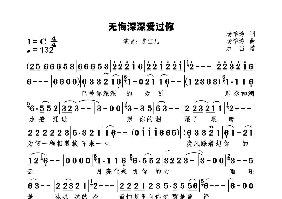 《无悔深深爱过你》是燕宝儿演唱的一首歌曲,拍号为4/4拍,歌曲速度为每分钟132拍,这份简谱共有一张高清图谱,图谱由 @水当 编配上传。
