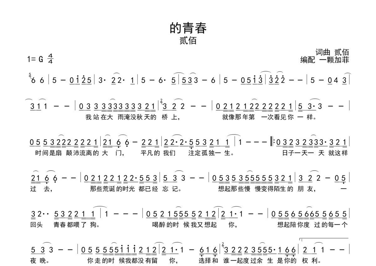 的青春简谱 - 贰佰演唱
