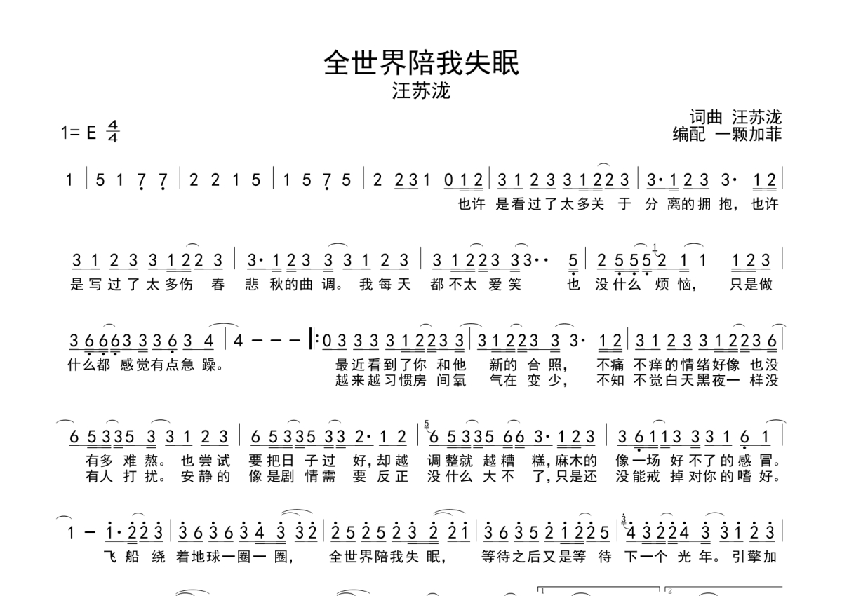 《全世界陪我失眠》是汪苏泷演唱的一首歌曲,这份简谱共有一张高清图谱,图谱由 @一颗加菲 编配上传。