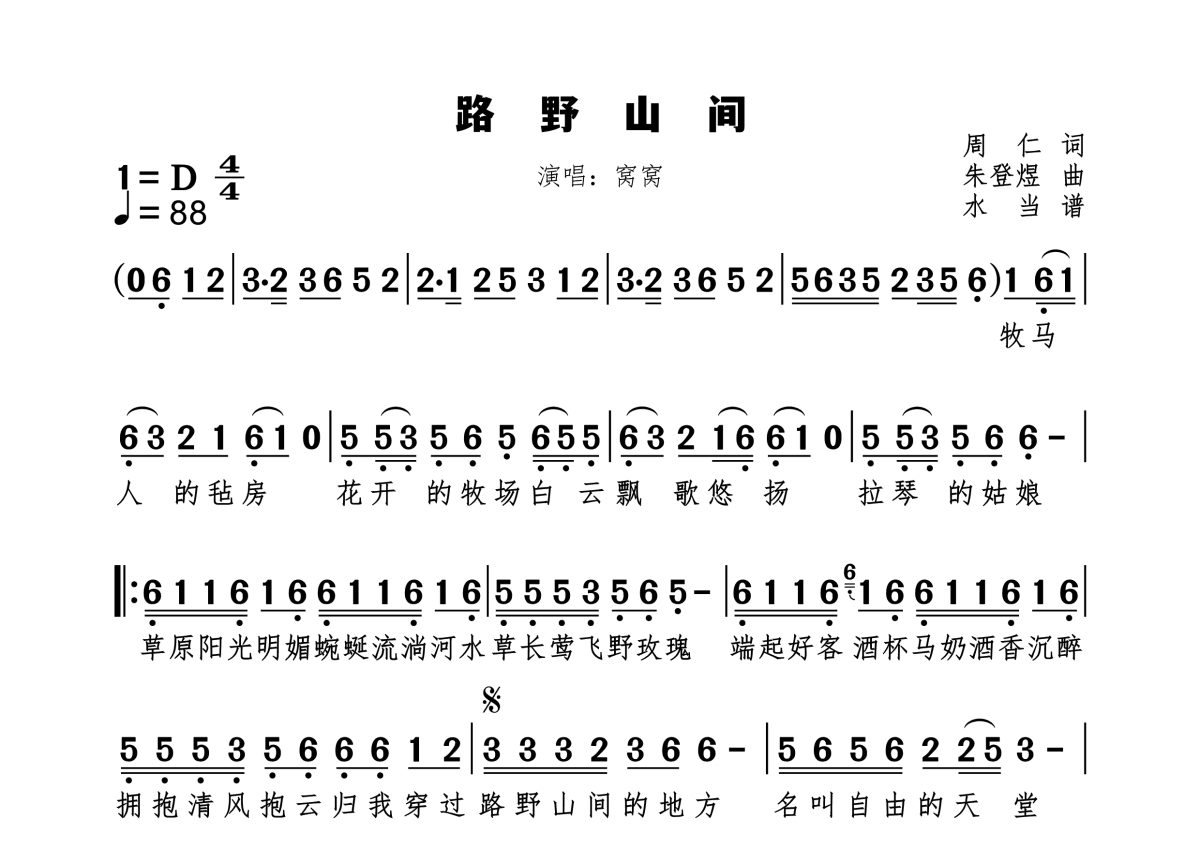《路野山间》是窝窝演唱的一首歌曲,拍号为4/4拍,歌曲速度为每分钟88拍,这份简谱共有一张高清图谱,图谱由 @水当 编配上传。