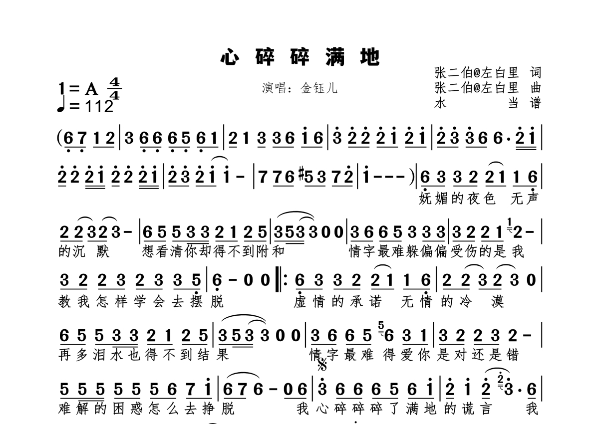 《心碎碎满地》是金钰儿演唱的一首歌曲,拍号为4/4拍,歌曲速度为每分钟112拍,这份简谱共有一张高清图谱,图谱由 @水当 编配上传。