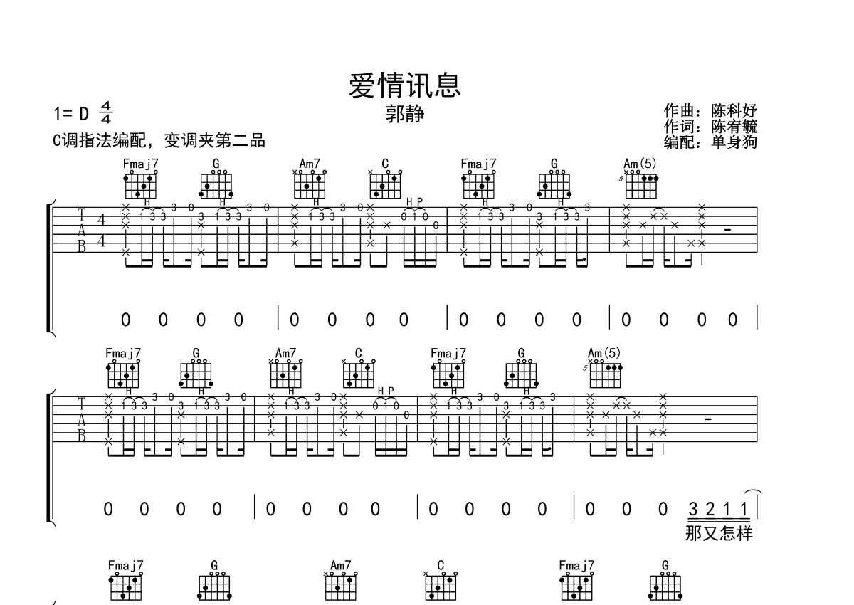 《爱情讯息》是郭静演唱的一首歌曲,拍号为4/4拍,歌曲原调为D调,但由于原调指法比较难,为了方便弹奏,本吉他谱采用的是C调指法编配,变调夹2品弹奏即为原调,当然也可以根据自己的音域改变变调夹位置,或者通过改变和弦调性,以方便自己弹奏,这份吉他谱共有五张高清图谱,图谱由 @单身狗 编配上传,图谱使用六线谱编配,包含吉他和弦指法、简谱以及歌词部分,使用这份爱情讯息吉他谱,可以让你更加方便地掌握这首歌曲的弹唱技巧,快来尝试吧。