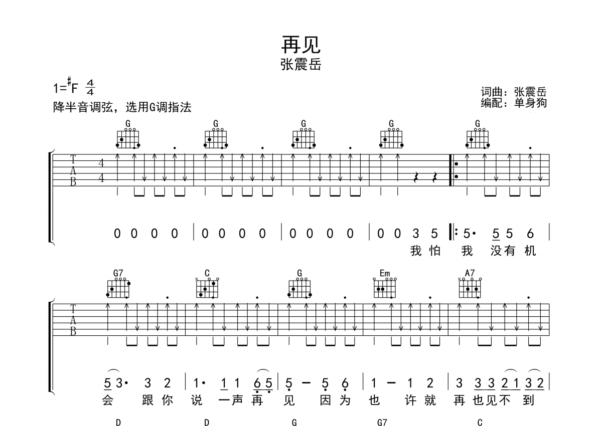 《再见》是张震岳演唱的一首歌曲,拍号为4/4拍,歌曲原调为Gb调,但由于原调指法比较难,为了方便弹奏,本吉他谱采用的是G调指法编配,降半音调弦弹奏即为原调,当然也可以根据自己的音域决定是否调弦,这份吉他谱共有三张高清图谱,图谱由 @单身狗 编配上传,图谱使用六线谱编配,包含吉他和弦指法、简谱以及歌词部分,使用这份再见吉他谱,可以让你更加方便地掌握这首歌曲的弹唱技巧,快来尝试吧。