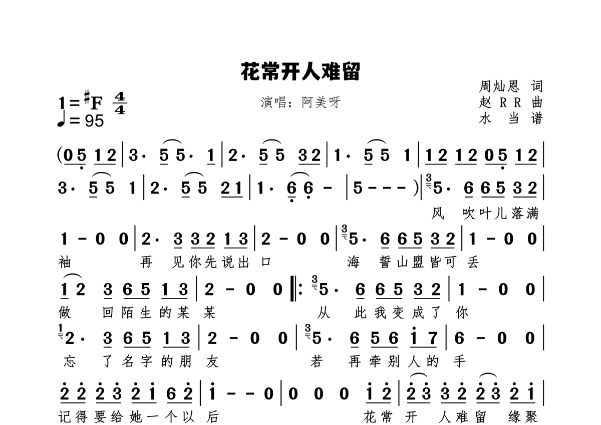 《花常开人难留》是阿美呀演唱的一首歌曲,拍号为4/4拍,歌曲速度为每分钟95拍,这份简谱共有一张高清图谱,图谱由 @水当 编配上传。