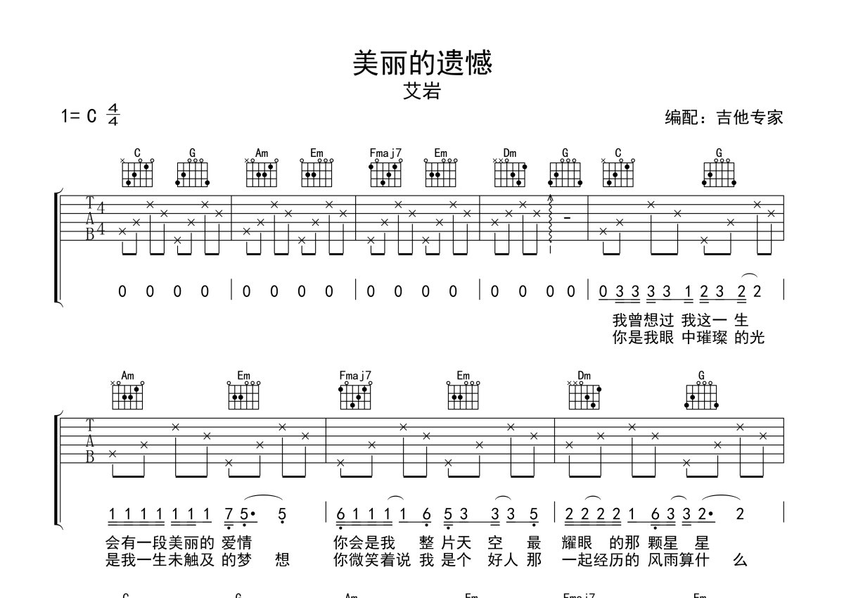 艾岩《美丽的遗憾》吉他谱 - C调弹唱六线谱