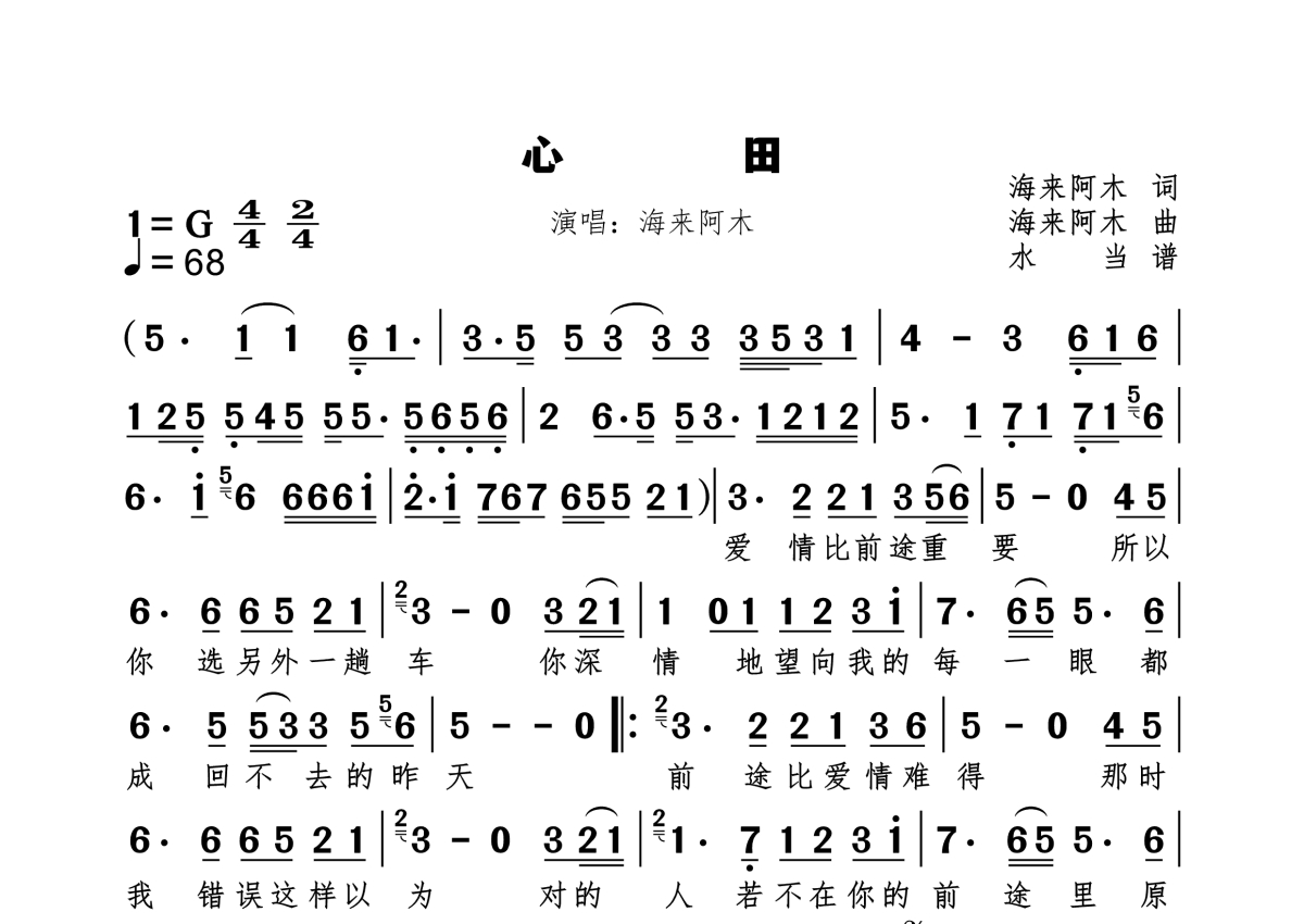 《心田》是海来阿木演唱的一首歌曲,拍号为4/4拍,歌曲速度为每分钟68拍,这份简谱共有一张高清图谱,图谱由 @水当 编配上传。